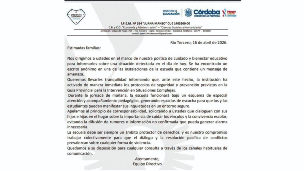 Un clima de preocupación se instaló en Río Tercero tras la aparición de mensajes amenazantes en varios establecimientos educativos, en el marco de una ola de intimidaciones que se replica en distintas provincias del país.